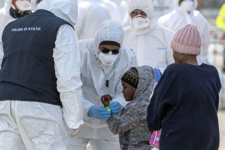 An Italian Red Cross agent wearing protective suit and mask puts a bracelet to a child as migrants rescued in the Mediterranean disembark from the Sea Watch NGO's ship on February 27, 2020, in the port of Messina, Sicily [File: Giovanni Isolino/AFP]