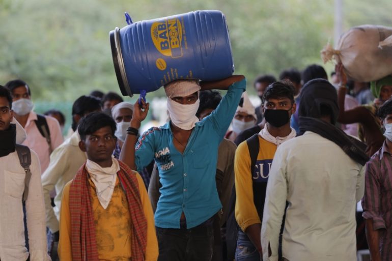 With no work and little public transport, many urban migrants attempting to return to their home villages have set out on gruelling journeys on foot or hitched rides in the back of trucks.