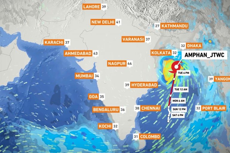 Amphan is equivalent to a Category 5 major Atlantic hurricane on the Saffir-Simpson scale and is expected to strengthen further. Winds of 270km/h (168 miles/h) gusting 325km/h (202 miles/h) are possible before it gradually begins to weaken off the coast of Odisha.
