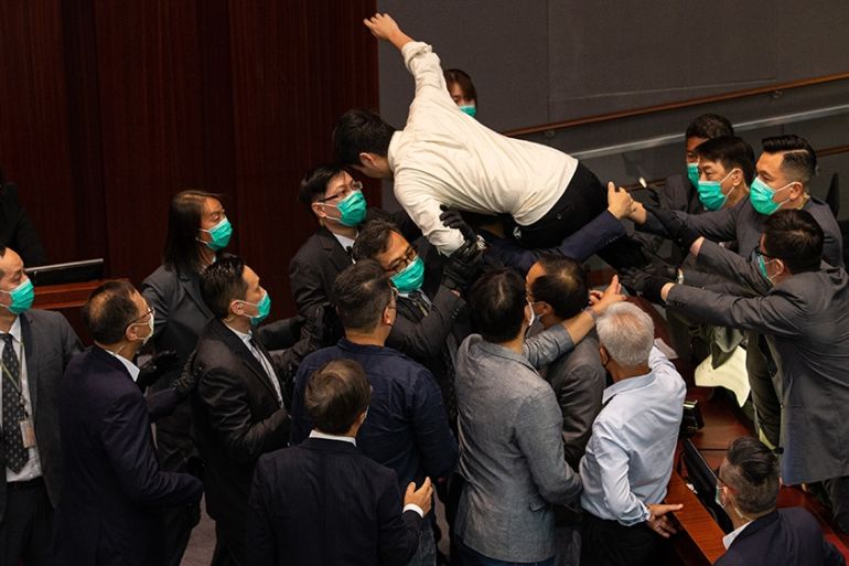 Pro-democracy legislators carried out of assembly as pro-Beijing legislators attempt to seize control of key committee.