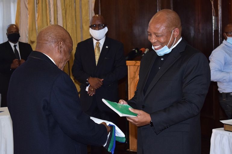 Thabane attended Wednesday’s swearing-in ceremony at the royal palace of King Letsie III, handing his successor a copy of the constitution to formally signal the transfer of power.