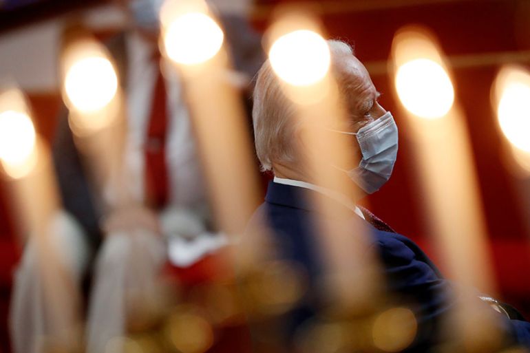 In the early moments of Monday’s gathering at the Bethel AME church in Biden’s hometown of Wilmington, Delaware, the former vice president listened quietly and took notes in a spiral notebook. All of the attendees, including Biden, wore face masks.
