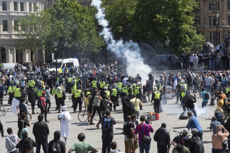 Police had separated two groups of about 100 people each in Trafalgar Square, one chanting “Black Lives Matter”, and the other racial slurs. Some groups jostled, tossed bottles and cans and set off fireworks, as riot police lined up.