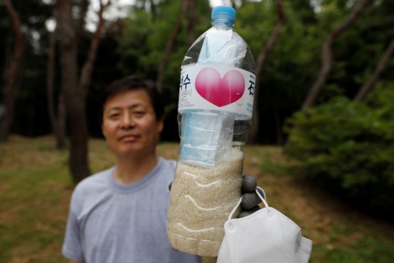 Gathered at a small park in Seoul, the group filled dozens of two-litre (4.2 pints) bottles with up to 1.5kg (3.3 pounds) of rice each, sending up to 700kg (1,543 lbs) of rice in total, Park said.