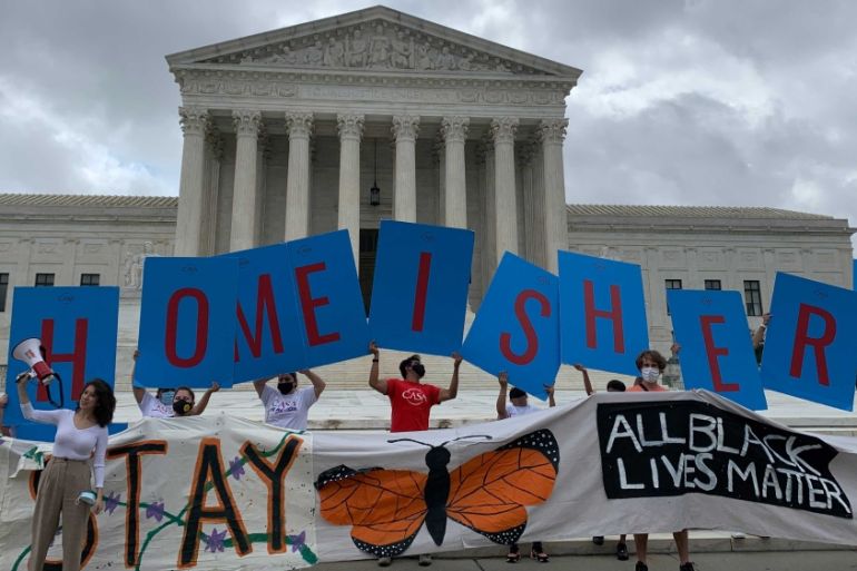 Washington, DC – Waving a large banner reading “here to stay” a dozen immigrants who arrived in the United States as children and their supporters celebrated outside of the Supreme Court on Thursday after the nation’s highest legal body dealt US President Donald Trump a major setback to his hardline immigration policies.