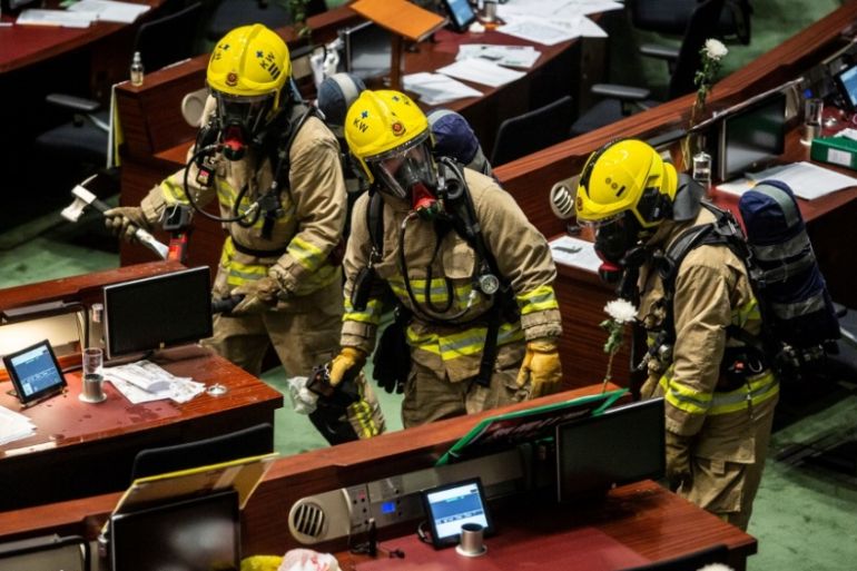 Police and firefighters entered Hong Kong’s legislature on Thursday after two pro-democracy legislators threw foul-smelling liquid to protest against China’s “murderous” crackdown by Chinese troops in and around Tiananmen Square 31 years ago.