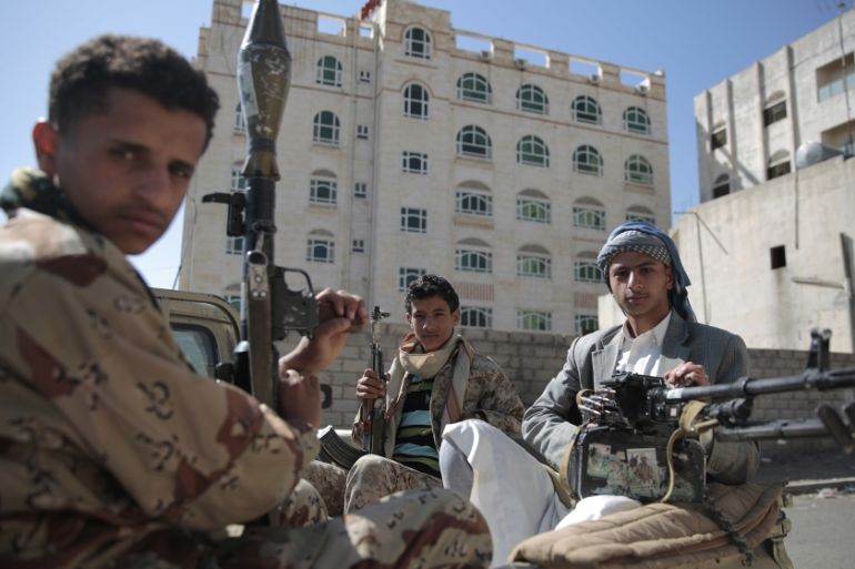 Armed Houthis gather outside the United Nations offices to denounce the Saudi-led coalition’s blockade [File: Khaled Abdullah/Reuters]