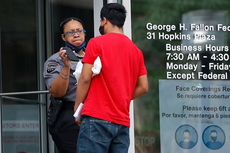 In Baltimore, Maryland people with hearings to reach final decisions were allowed to enter the federal building housing the immigration court only if they wore masks. Benches in a courtroom and seats in a waiting area were blocked off with tape, and social distancing signs were placed on the floor and in the elevators.