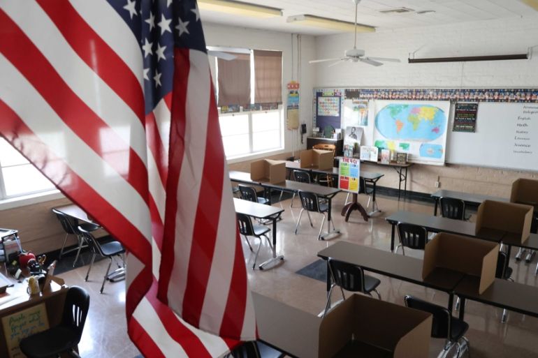 Schools have varied methods to maintain social distancing between students as they try to find ways to reopen [Lucy Nicholson/Reuters]