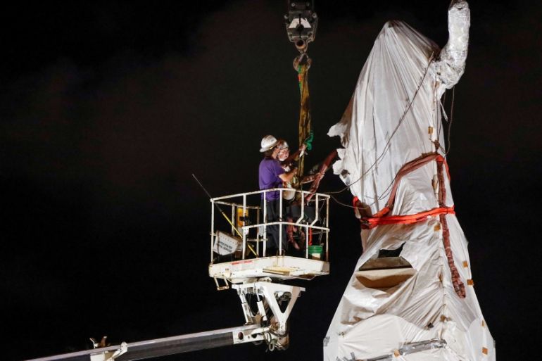Crews used a large crane to remove the statue in downtown Chicago’s Grant Park from its pedestal. A small crowd cheered and passing cars honked as the statue came down at about 3am local time. The second statue was removed at about 5:30am from Arrigo Park in Chicago’s Little Italy neighbourhood.