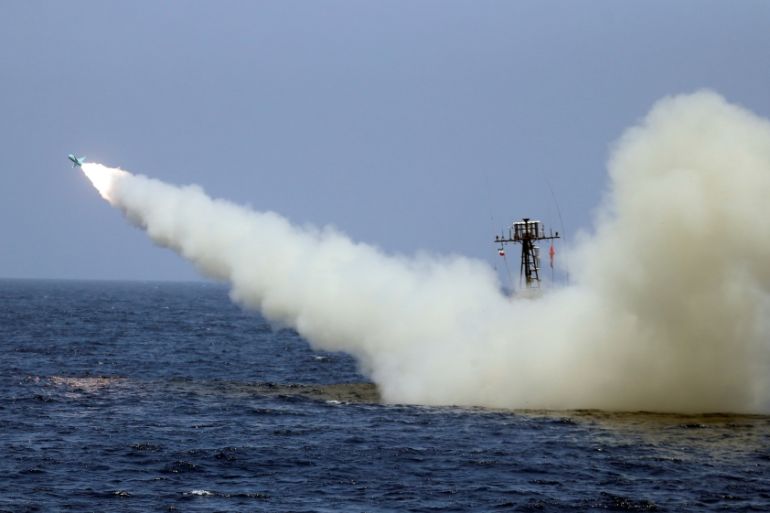 Iran’s paramilitary Revolutionary Guard fired a missile from a helicopter targeting a replica US aircraft carrier in the strategic Strait of Hormuz, state television reported on Tuesday, an exercise aimed at threatening the US amid tensions between Tehran and Washington.