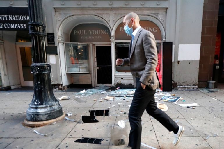 Stores miles from downtown were also ransacked, with parking lots littered with glass and items from inside the stores. Clothes hangers and boxes that once contained television sets and other electronics were seen – evidence that thieves had taken racks of clothes and removed them from the hangers.