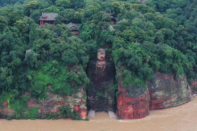 Staff, police and volunteers used sandbags to try and protect the 71-metre (233-foot) Leshan Giant Buddha, a UNESCO World Heritage site in southwestern Sichuan province, as muddy water rose over its toes for the first time since 1949, state broadcaster CCTV reported.