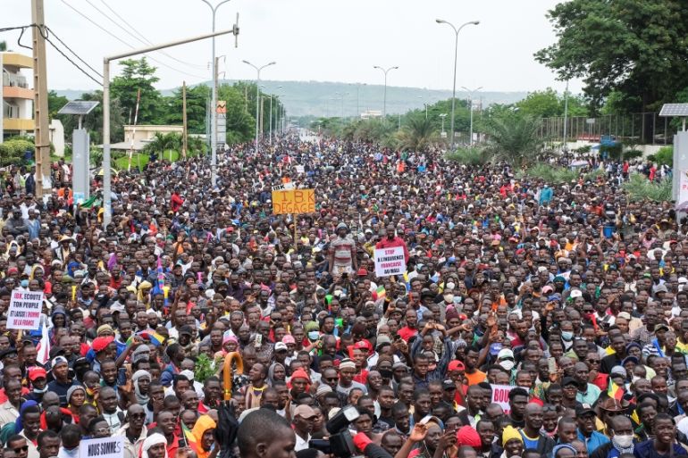 Opposition supporters attend a mass protest in Bamako demanding the resignation of Keita [Rey Byhre/Reuters]