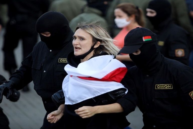 Riot police detained hundreds of women as opposition protesters marched through the Belarusian capital Minsk demanding an end to President Alexander Lukashenko’s rule.