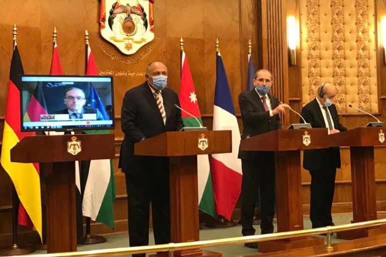 The top diplomats from France, Egypt and Jordan held a meeting on Thursday in Amman. Germany’s Heiko Maas joined online as he was forced to go into quarantine a day earlier due to a coronavirus scare.