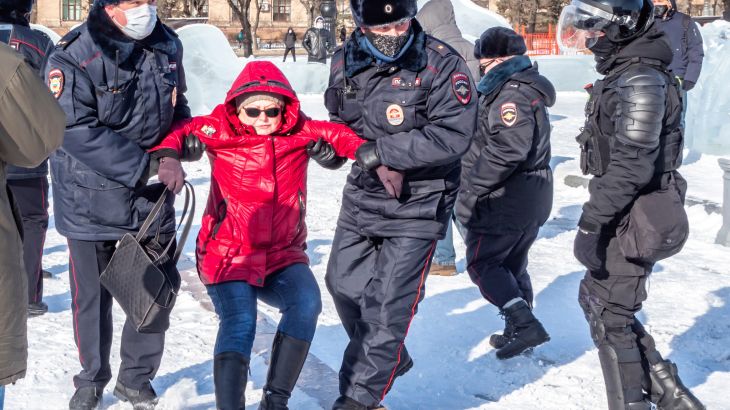 Footage from Vladivostok showed dozens of protesters escaping the police on the frozen waters of the Amur Bay and circle dancing. More than 100 arrests were made there.