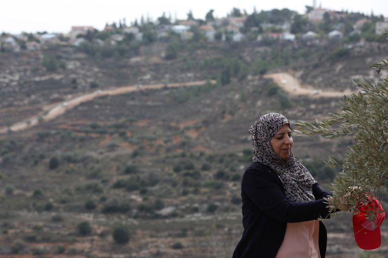 In the nearby village of Qaryout, Rima Qaryouti and her family spent the day working on their olive grove overlooking the large settlement of Shilo.