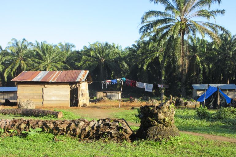 With no land to farm or build a home, some Chinebal residents moved onto the contested land, clearing parts of the plantation. Close to 100 families now live there in simple wooden homes spaced out in a patchwork of fallen and standing palms, maize and other subsistence crops.