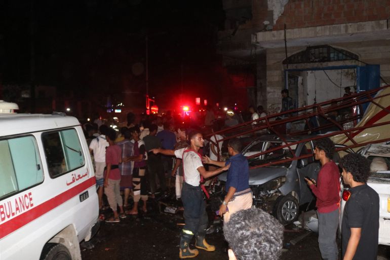 At least 12 civilians were killed in the blast in Aden, the Yemeni government’s interim capital.