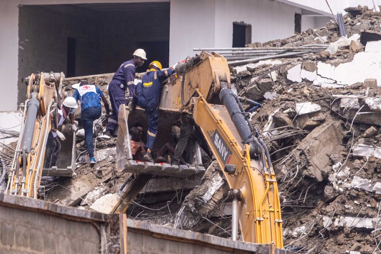 Emergency services used earthmoving equipment to lift chunks of masonry at the site in the affluent neighbourhood of Ikoyi after torrential rains pounded Lagos overnight and briefly stopped the search.