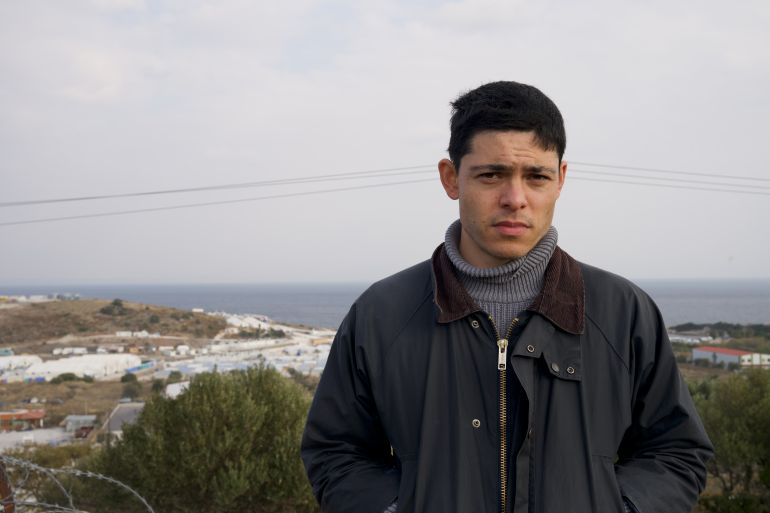 In the distance is a new refugee camp, built in the wake of the fire that razed the infamous Moria camp to the ground last year.