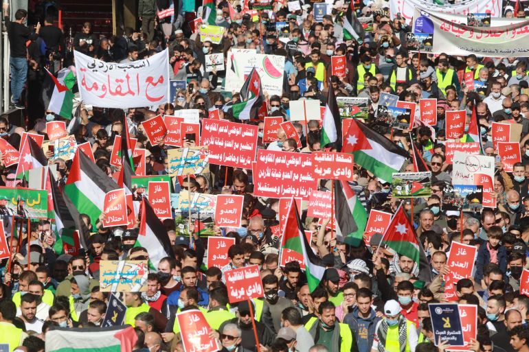 Jordanians at the protest on Friday rejected the agreement, saying it moved towards normalising ties with Israel while it continues to occupy the Palestinian territories. Opponents also warned that the deal would force Jordan to be dependent on its neighbour.