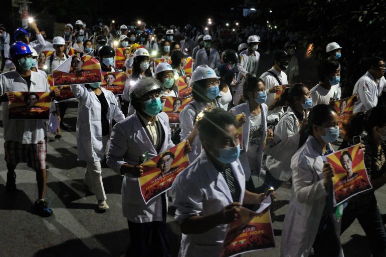 Doctors and healthcare workers in Myanmar’s Mandalay kicked off another day of anti-coup demonstrations, staging a peaceful march at dawn in a bid to minimise the risk of confrontation with security forces.