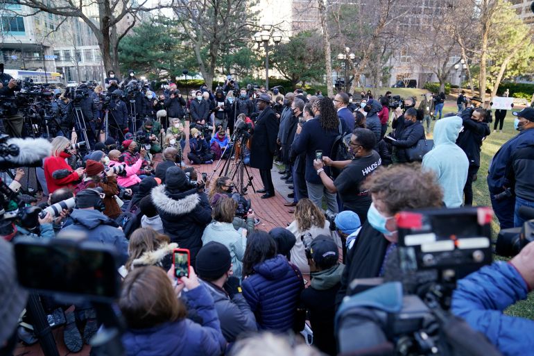 “America is on trial,” said civil rights leader Reverend Al Sharpton, who joined the family members and lawyers in front of the courthouse.