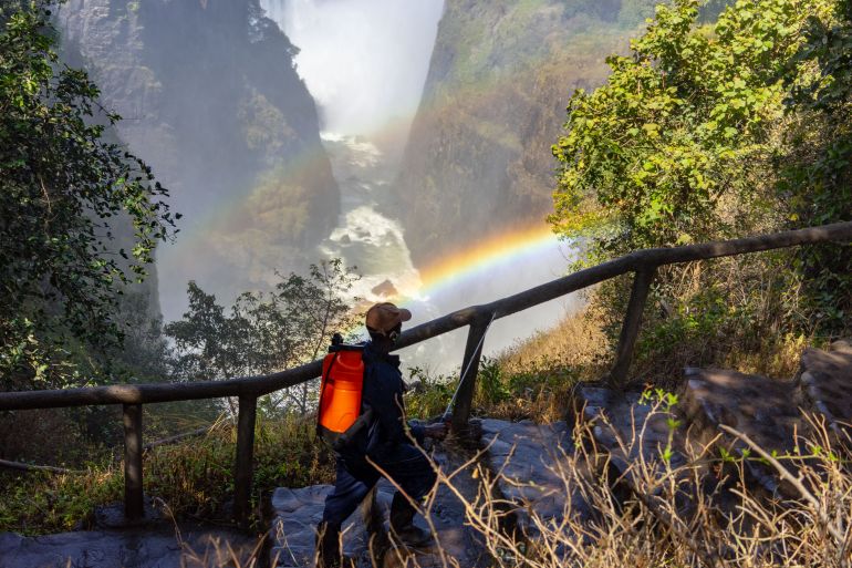 Victoria Falls, Zimbabwe – With every passing minute, 500 million cubic metres of roaring water rush over the edge, falling into a gorge more than 100 metres below. The sound is thundering, the sight spectacular.