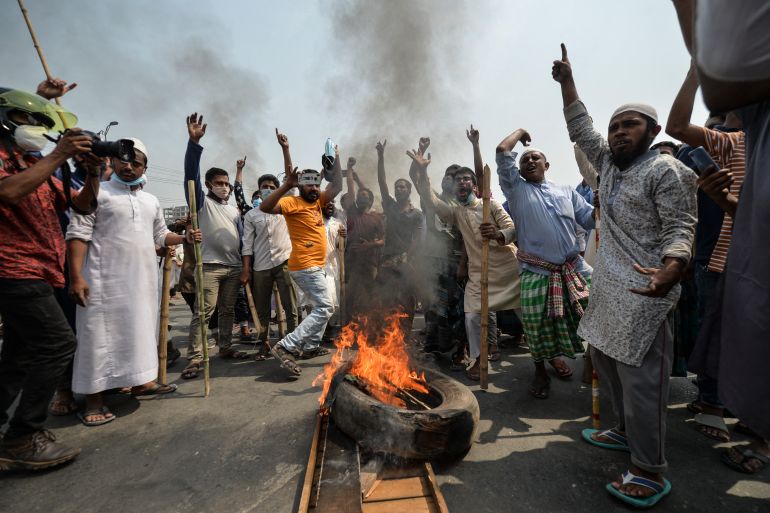 The protesters – mostly from the religious hardline group Hefazat-e-Islam – were angry at the visit of Indian Prime Minister Narendra Modi as Bangladesh marked 50 years of independence, accusing him of stoking communal violence against Muslims in his country.
