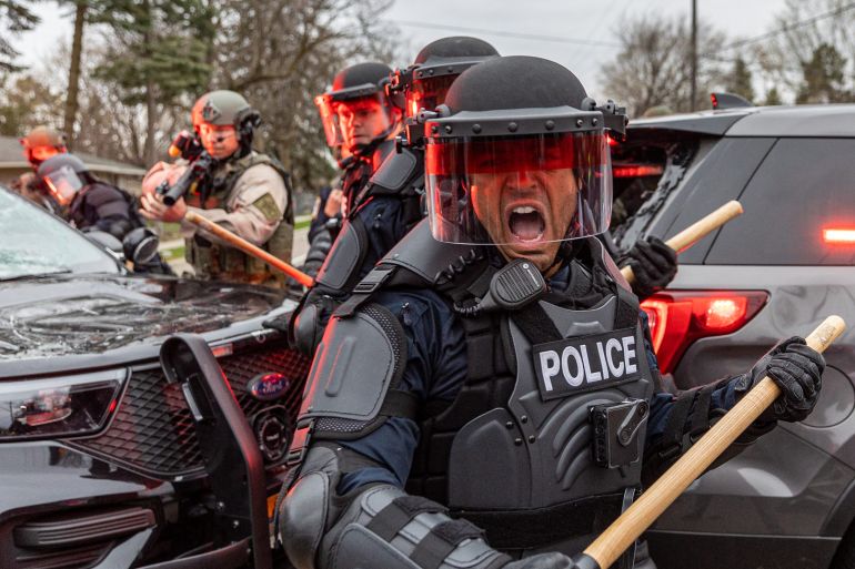 Hundreds of people, some visibly upset and one carrying a sign demanding “Justice for George Floyd”, confronted police in riot gear on Sunday night, hours after the officer shot 20-year-old Daunte Wright in his car in the Minneapolis suburb of Brooklyn Center.