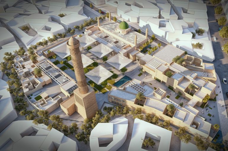 The 12th century mosque, famous for its leaning minaret was damaged in 2017 fighting between ISIL, US and Iraqi forces.
