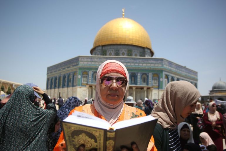 By early afternoon, Palestinian women in headscarves and long robes were seated on the carpeted floor of the Al-Aqsa mosque compound – considered the third holiest site in Islam – reading the Quran holy book.