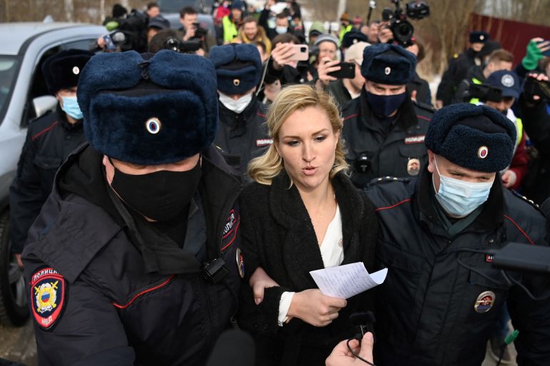 Anastasia Vasilyeva, who had claimed Navalny needed to go to a “specialised hospital” and warned it was “quite possible” he may have been infected with coronavirus, was detained as the rally got under way.