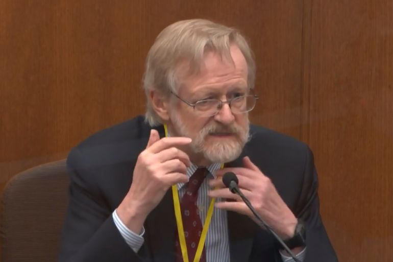 He cited several other factors that he said made it difficult for Floyd to breathe; officers lifting up on the suspect’s handcuffs, the hard surface of the street, his prone position, his turned head and a knee on his back.