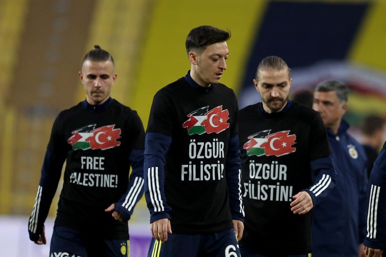 Similar demonstrations took place in Kuwait and Qatar, while in Turkey, players from the Istanbul-based side Fenerbahce warmed up for a recent game wearing T-shirts with the message “Free Palestine”.
