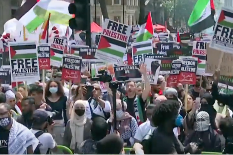 The protest was the latest in a series of pro-Palestine rallies which have taken place in London since tensions escalated in occupied East Jerusalem over Israel’s planned forced displacement of Palestinian families from Sheikh Jarrah, attacks on the Al-Aqsa Mosque compound, and Israel’s military assault on Gaza.