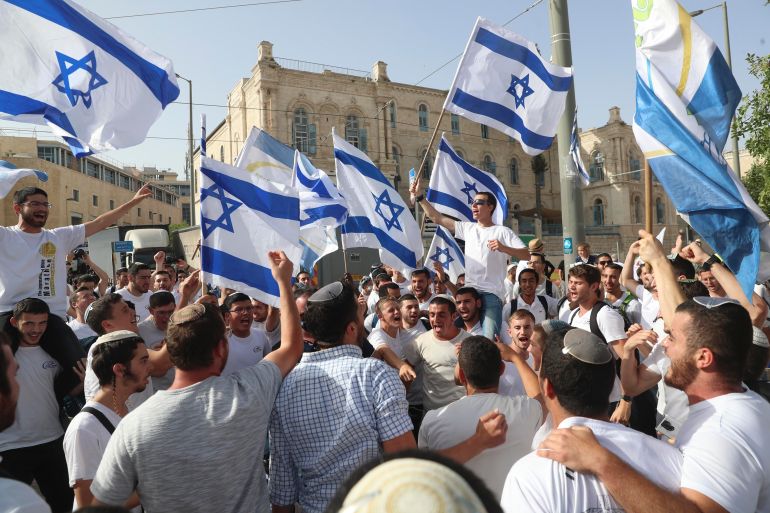 The march comes as tensions remain high in occupied East Jerusalem over Israel’s planned forced displacement of Palestinian families from the neighbourhood of Sheikh Jarrah, just north of the Old City.