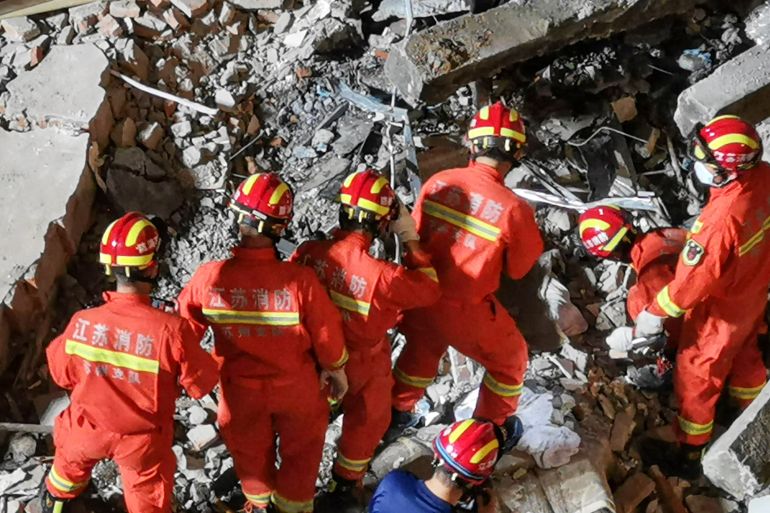 Images showed orange-clad rescue workers sorting through large piles of rubble. State media said more than 600 firefighters, 112 fire trucks and seven rescue dogs had been deployed to the scene.