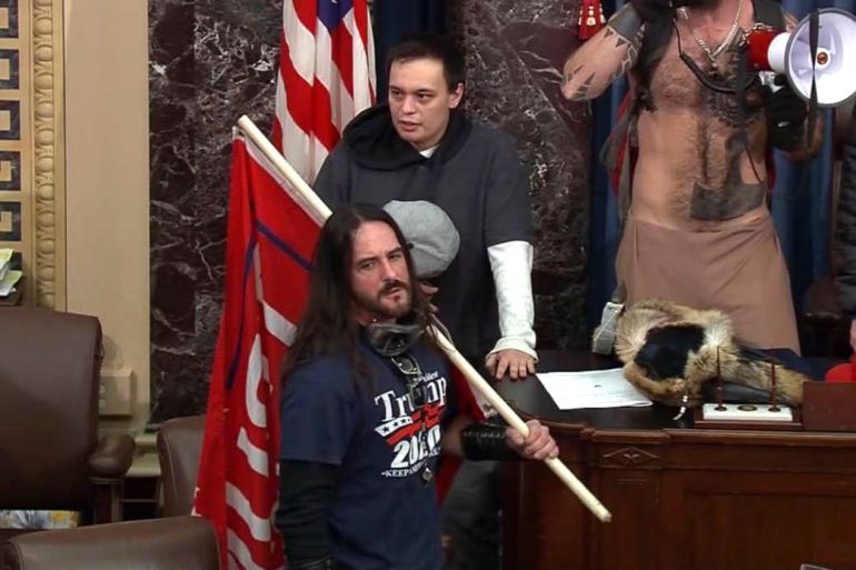 Video footage shows Hodgkins wearing a Trump 2020 T-shirt, the flag flung over his shoulder and eye goggles around his neck, inside the Senate. He took a selfie with a self-described shaman in a horned helmet and other rioters on the dais behind him.