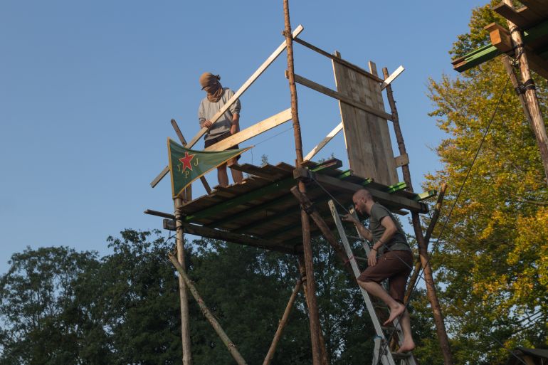 In the surrounding fields, dozens of volunteers prepare defensive structures for the showdown, lashing together scrap wood to build towers and huts. Above them, elaborate cabins are hoisted high into the boughs of trees.