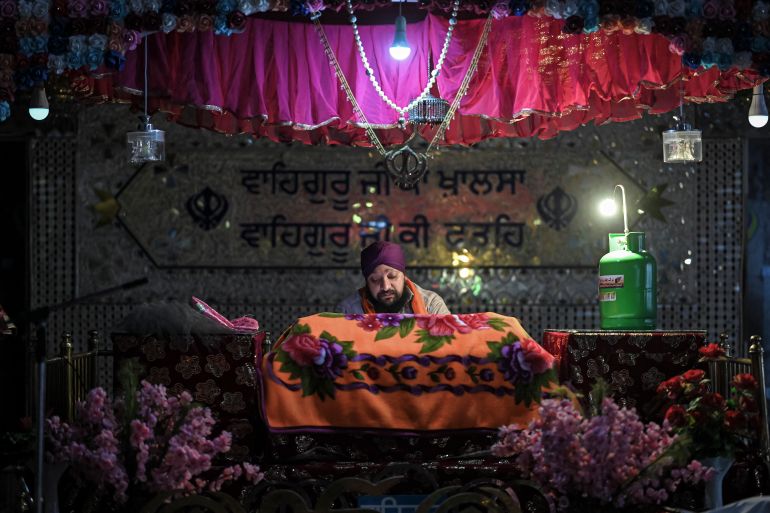 Sitting barefoot on a floor covered with thick red rugs, they warm themselves around stoves and listen to a recitation from the Guru Granth Sahib, the Sikh holy book.