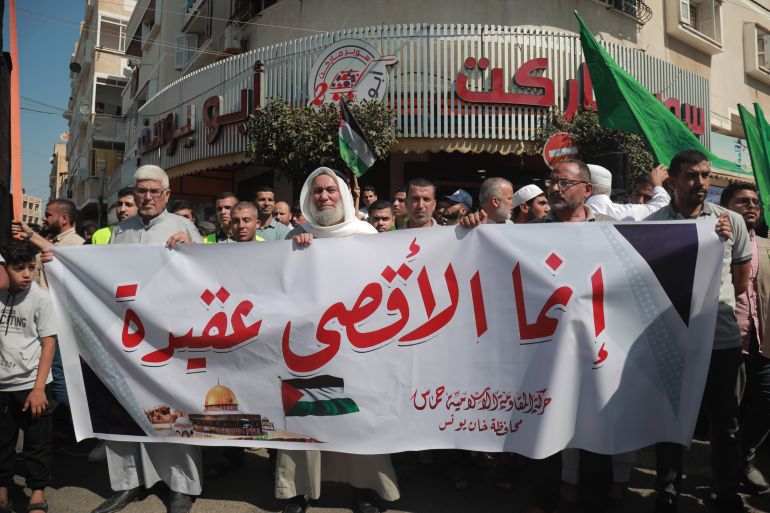 The rallies on Friday, called by Hamas and Islamic Jihad, began from mosques in Khan Yunis in southern Gaza and Jabalia in the northern Gaza Strip, where the demonstrators carried banners that read: “Palestine brings us together, Jerusalem is ours, We will defend Jerusalem with our hands and souls.”
