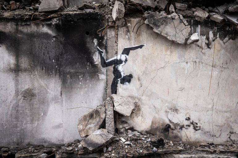Banksy artworks appear on destroyed buildings in Ukraine