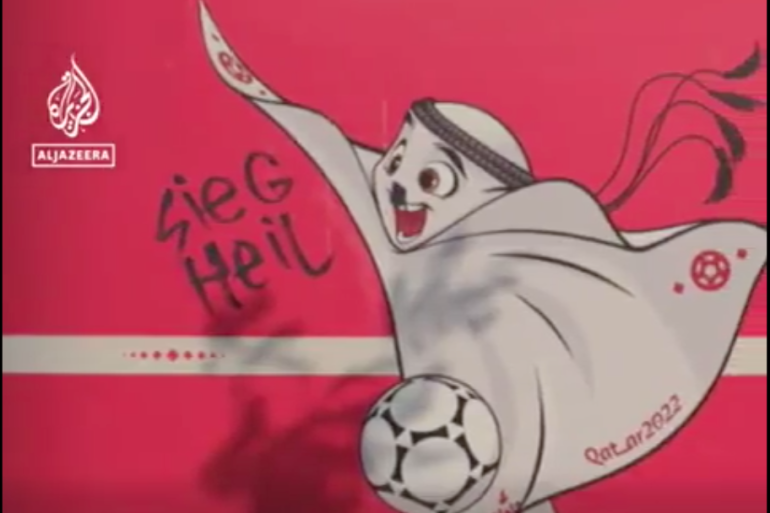 In less than a minute, the video “reports” that three Ukrainians were detained after they painted a “Hitler moustache” on La’eeb, the 2022 World Cup’s mascot, and scribbled a Nazi salute next to it.