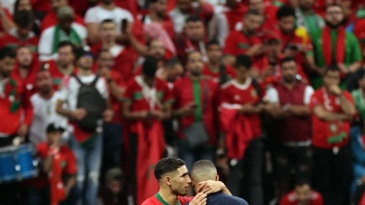 Amid the wild celebrations from the French players, their superstar forward, Kylian Mbappe, could be seen weaving his way around his teammates before leaning over his good friend and stalwart of the Moroccan defence, Achraf Hakimi. He helped the full-back to his feet before the two men shared a warm embrace.