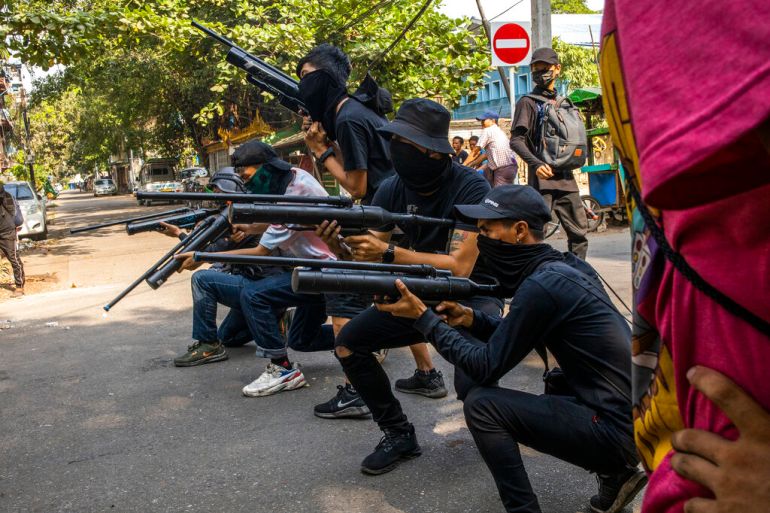 ![Protesters against the military coup in Myanmar line up with homemade air rifles during a demonstration in Yangon, Myanmar in April 2021 [File: AP Photo]](https://www.aljazeera.com/wp-content/uploads/2022/12/AP21269141651286.jpg?resize=770%2C513&quality=80)