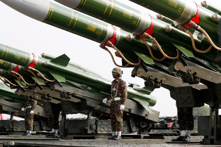 ![Myanmar Air Force Jet fighters drop bombs during military exercises in 2018, in the Ayeyarwaddy delta region, Myanmar [File: Lynn Bo Bo/pool/AP]](https://www.aljazeera.com/wp-content/uploads/2022/07/h_57578254.jpg?resize=770%2C513&quality=80)