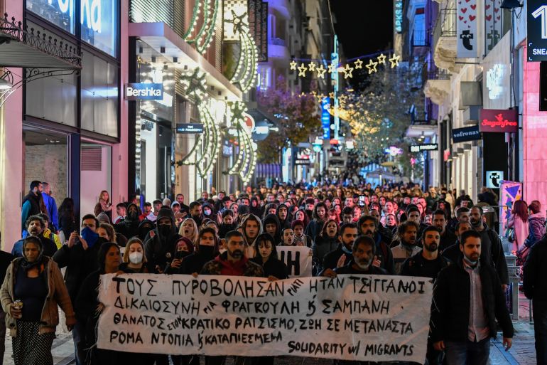 The demonstrators in Greece’s capital had a banner reading: “They shot them because they were Roma.”